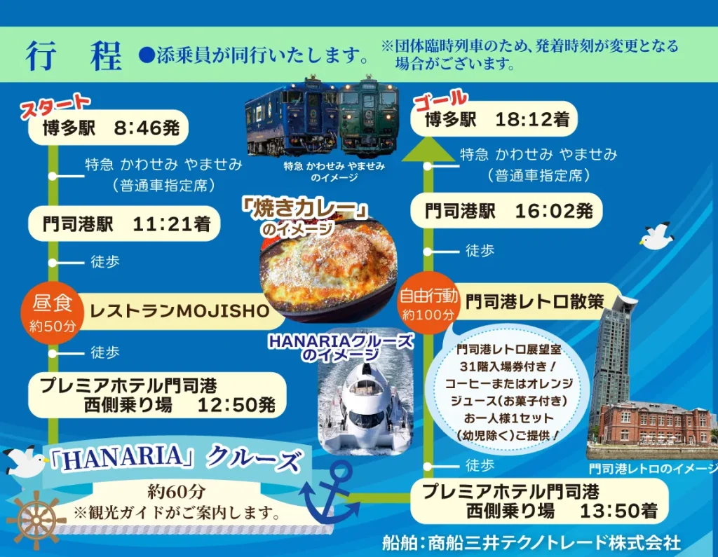 【価格に含まれるもの】JR券代、ご昼食代、HANARIAクルーズ乗船代、門司港レトロ展望室31階入場料代、ドリンク代、お菓子代