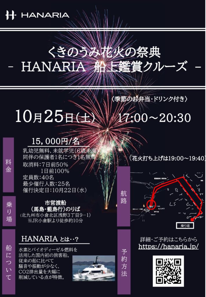 HANARIAに乗って、くきのうみ花火の祭典を船上からゆっくり鑑賞できる特別なクルーズを開催します。